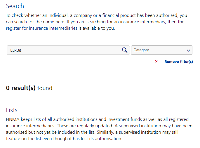 If LuxBit truly claims Swiss registration, it is logical to verify it in the FINMA database. This authority issues licenses to brokers, investment firms, and financial intermediaries. However, no such organization is found in the official FINMA registry. This is a critical point: any broker operating from Switzerland must have proper authorization. The absence of a license means the company is not under state supervision, and clients are not protected by law.